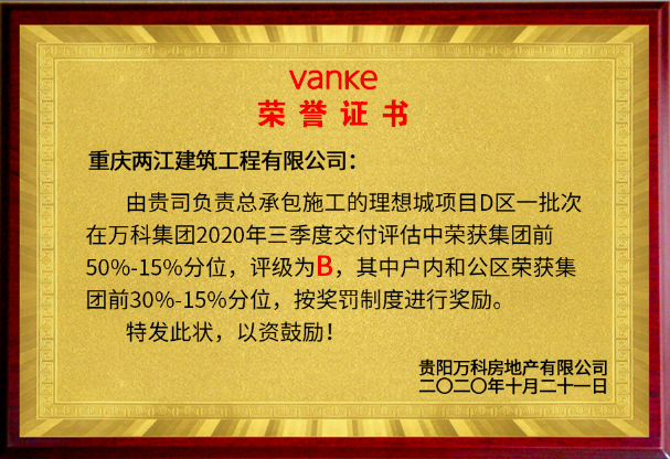 • 2020年三季度交付评估中荣获万科集团前50-15分位评级为B